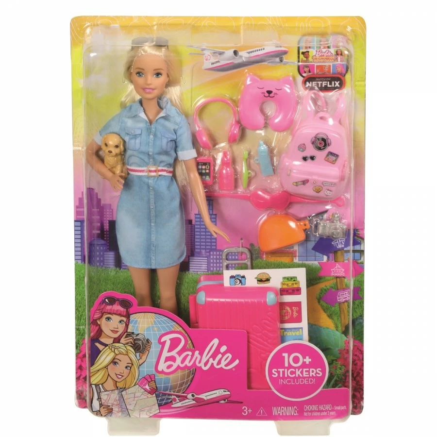 This Barbie Travel Doll is from the Barbie Dreamhouse Adventure Travel Playset, which comprises a Barbie doll, her sister Stacey and her friend Bassey. Each doll playset comes with many travel accessories and stickers. Barbie comes with a light pink backpack with a variety of stickers for this bag. The straps for this backpack is soft rubber which comes apart at the bottom joint for easy mounting onto Barbie’s back. Her backpack can carry travel accessories which include a cosmetic bag that fits her toothbrush and toothpaste. A neck pillow and night mask to help her sleep on the plane. Her camera, a small water bottle and a small puppy figure. Lastly, there is a pink suitcase with a set of stickers to go with it. Barbie comes with a pair of sunglasses and a 1-piece blue dress with a white and red belt to which Barbie’s phone can be attached. Suitable for ages 3 and up.